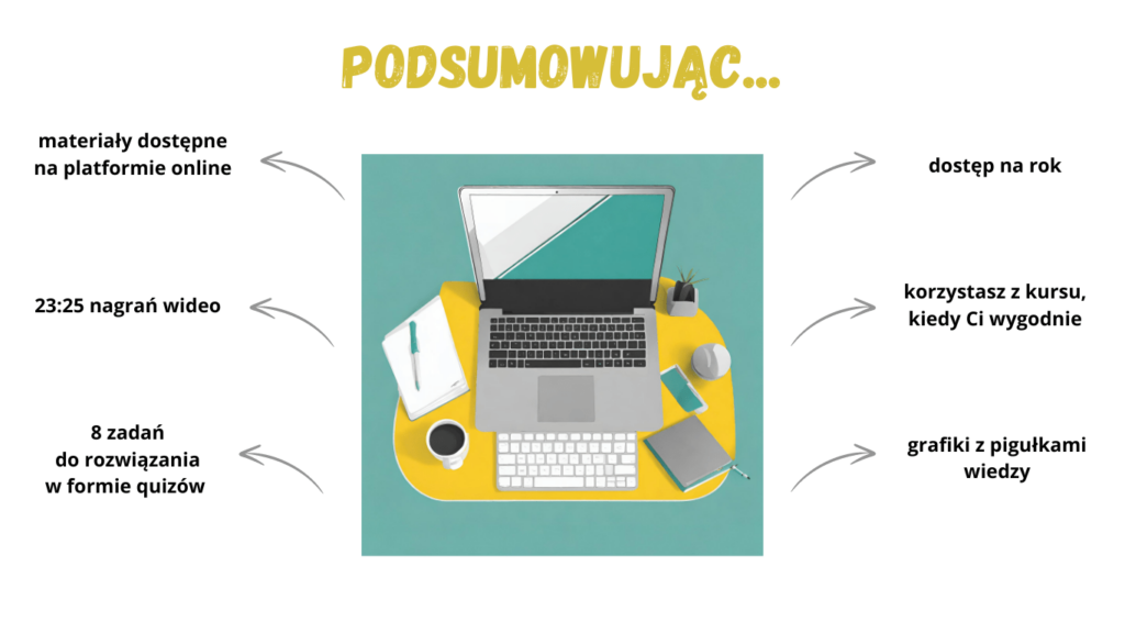 Kurs jest dostępny na platformie szkoleniowej online. Wystarczy, że po zakupie zalogujesz się na swoje konto i możesz korzystać z dostępnych materiałów o dowolnej, wybranej przez siebie porze.